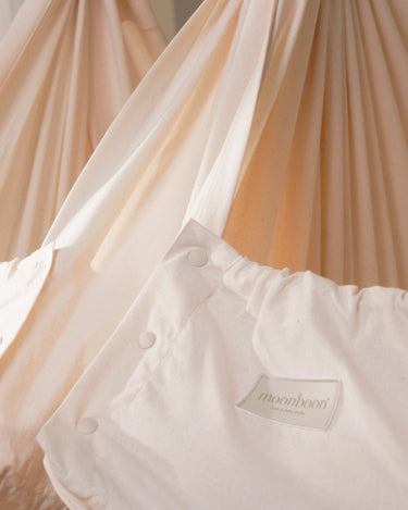 Moonboon's Babyhangmat voor Tweelingen is gemaakt van 100% biologisch katoen met GOTS-keurmerk van de beste kwaliteit. De dwarspen is van massief walnotenhout dat is behandeld met bijenwas voor een mooie afwerking en om de kleur te behouden. De twee biologische matrassen van kapok hebben een 100% biologische hoes en een GOTS-keurmerk. De banden zijn ook van 100% biologisch katoen.