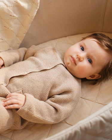 Onze Nature-kleurstelling is gemaakt van ongeverfd, onbehandeld katoen. Deze stof is veilig voor baby's en de textuur voelt zacht aan.