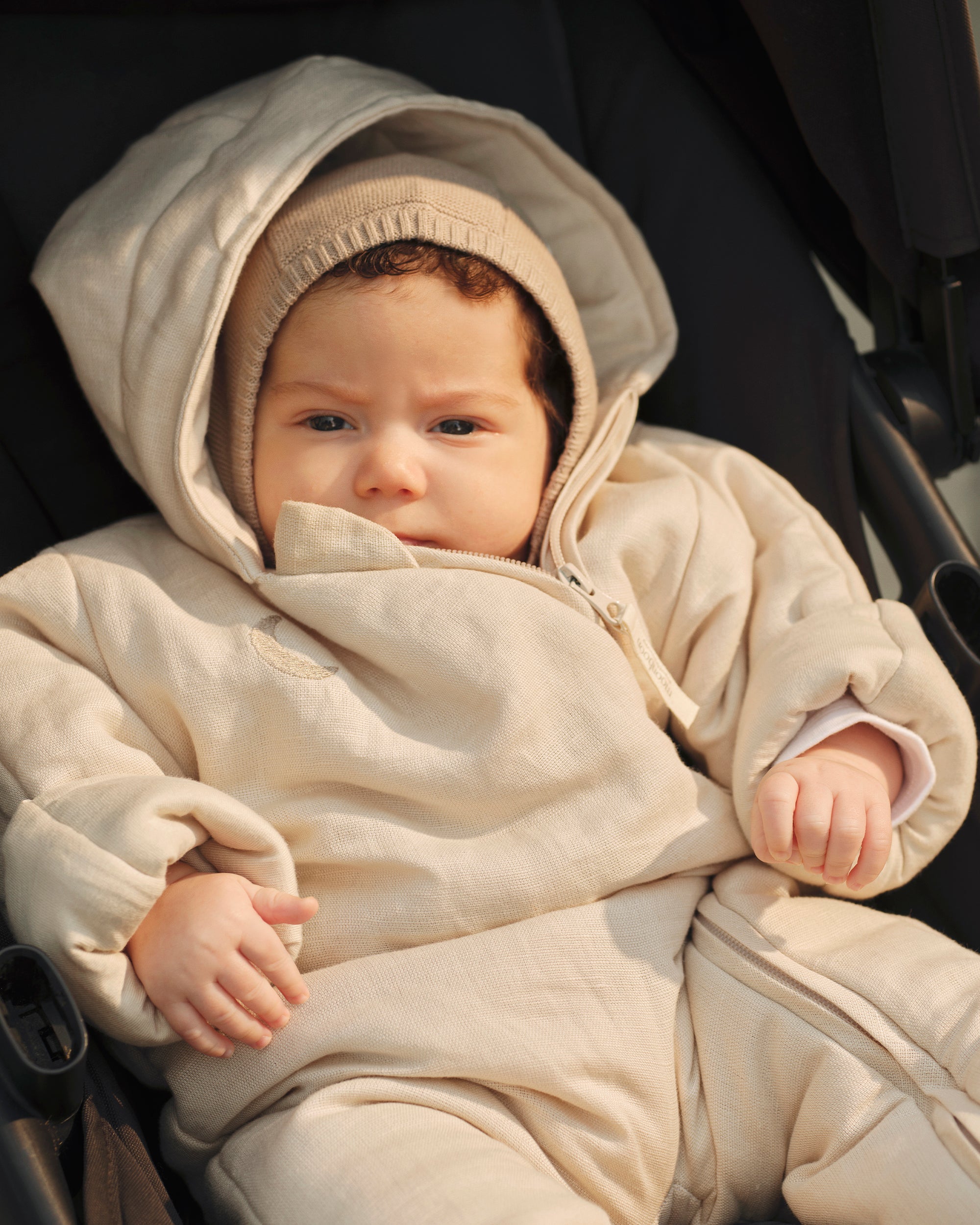 Ons zachte buitenpak is perfect voor wandelingen met de kinderwagen of in de draagzak, en combineert stijl en comfort in elk detail.