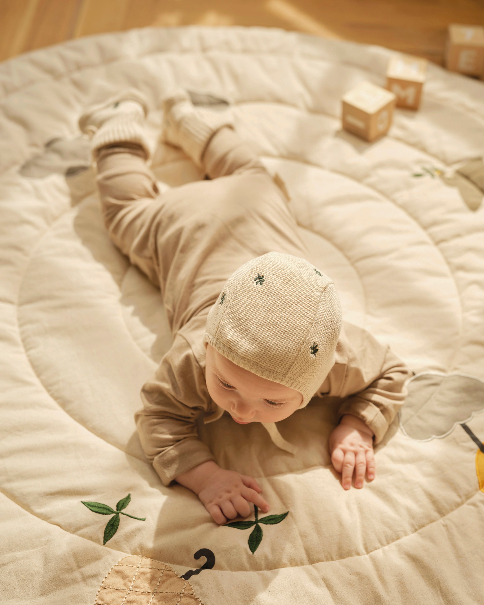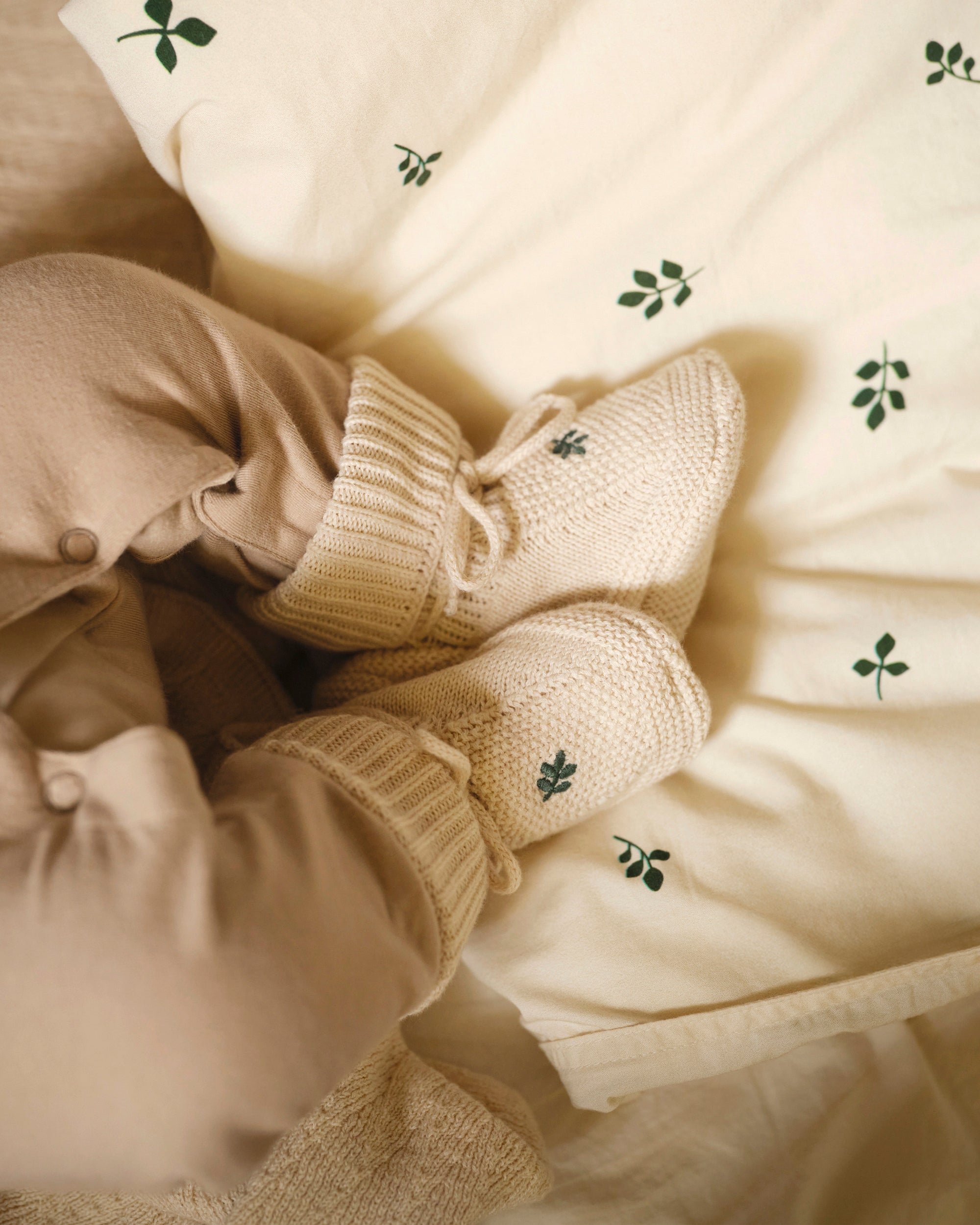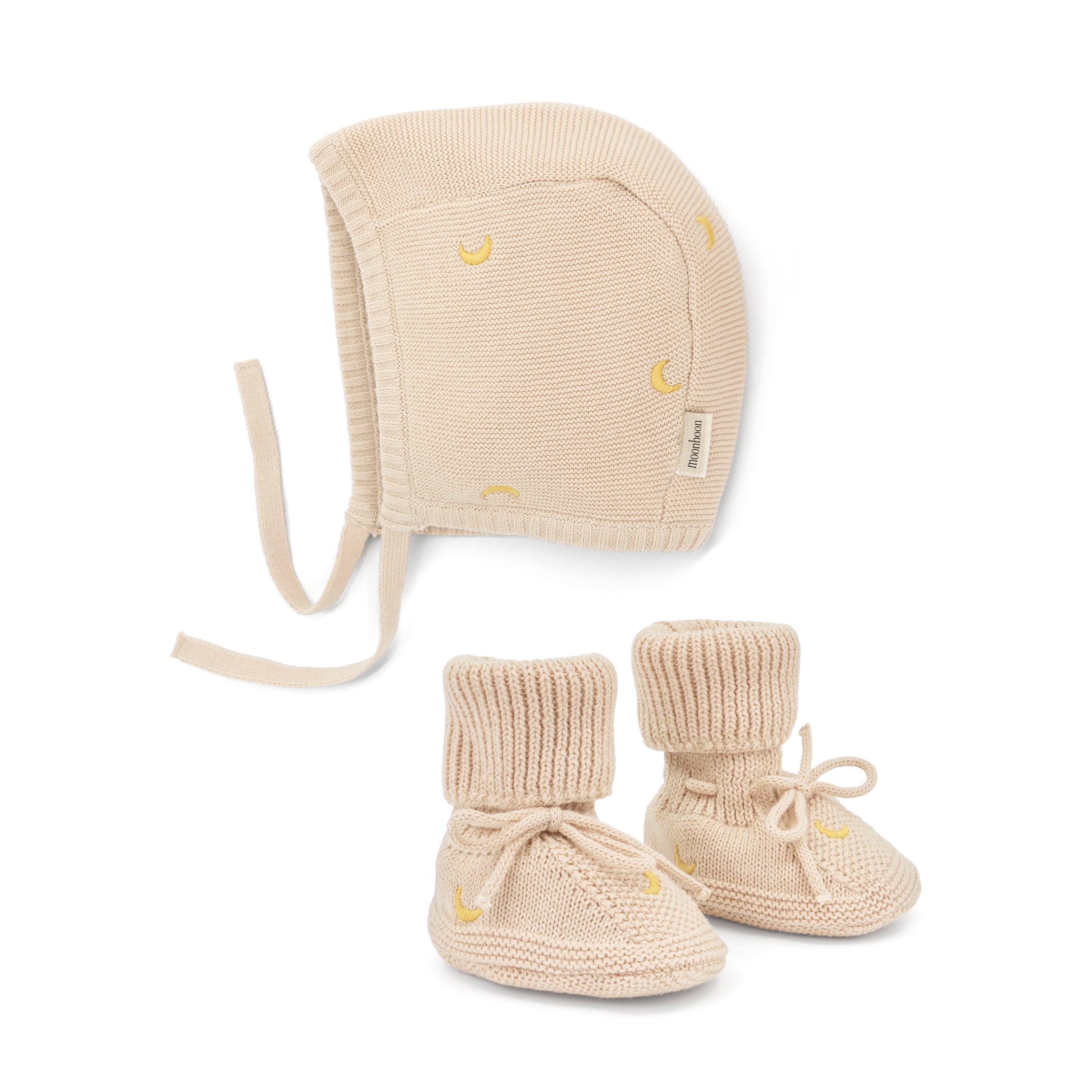 Gebreid mutsje met bijpassende slofjes, zorgvuldig vervaardigd van gecertificeerd biologisch katoen met delicate borduursels, zodat je baby er de hele dag lekker warm en comfortabel bij ligt. Een schattige outfit voor de eerste dag thuis of een attent cadeau voor het hele jaar door.
